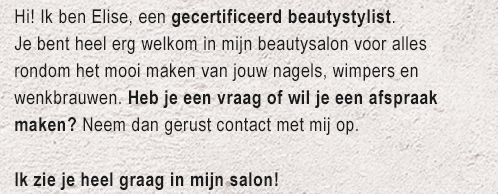 Ik ben een gediplomeerd nagelstyliste en bied alles wat je mag verwachten van professionele nagel- en handverzorging. Mooie nagels liggen hierdoor binnen ieders handbereik. Wil je een frisse zomerkleur, chique winterkleur, french manicure, glitters of naturel look? Alles is mogelijk!